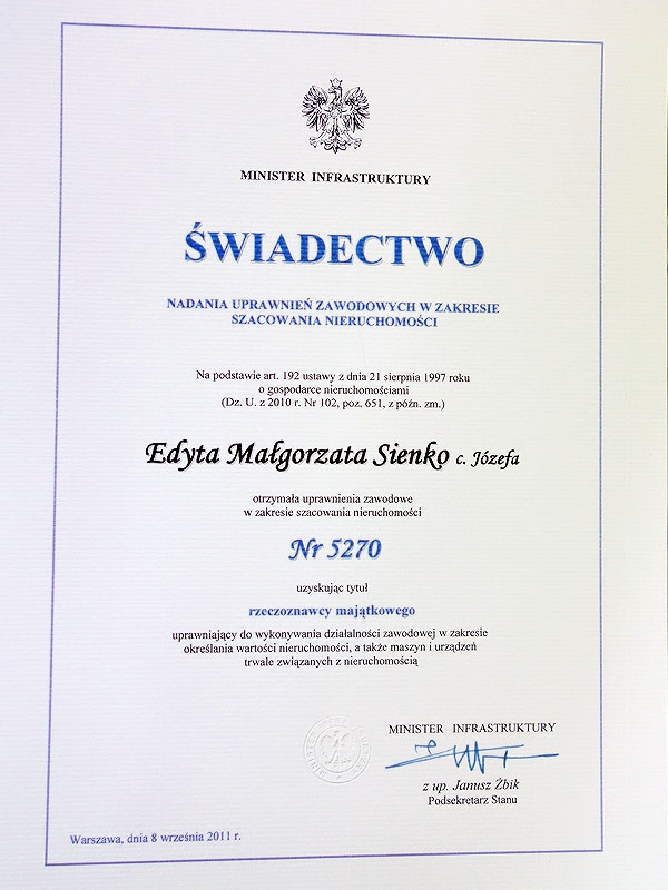 Właścicielem Firmy SEM jest Rzeczoznawca Majątkowy mgr Edyta Małgorzata Sienko. Uprawnienia zawodowe w zakresie szacowania nieruchomości nr 5270 nadane przez Ministra Infrastruktury dnia 08 września 2011 r. (Centralny Rejestr Rzeczoznawców Majątkowych – strona Ministerstwa Infrastruktury : www.mi.gov.pl ).