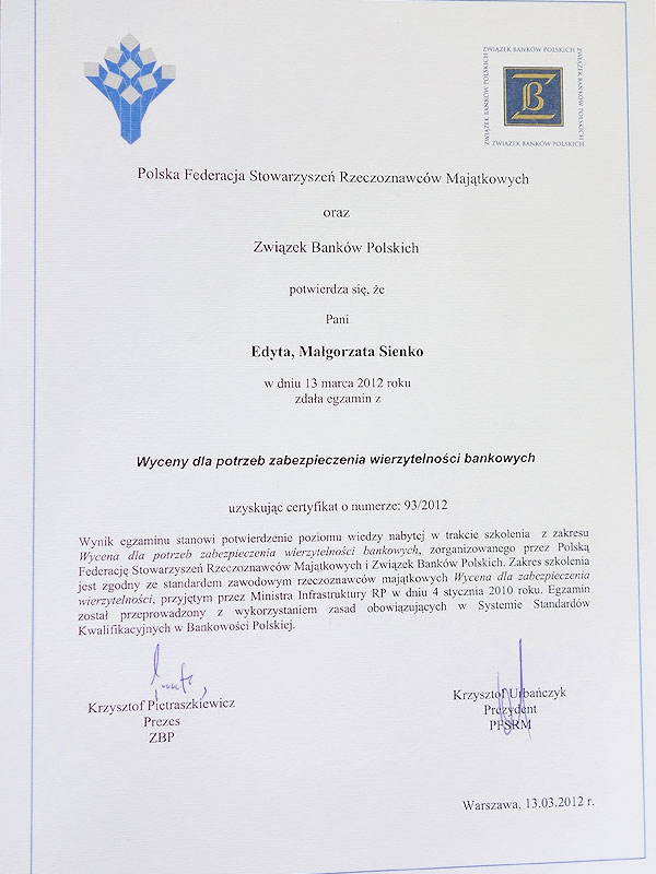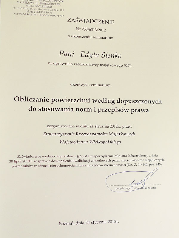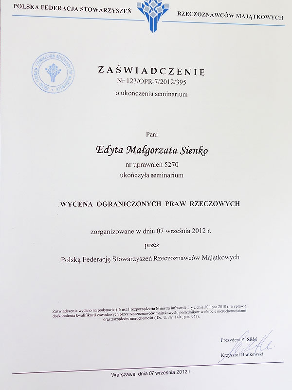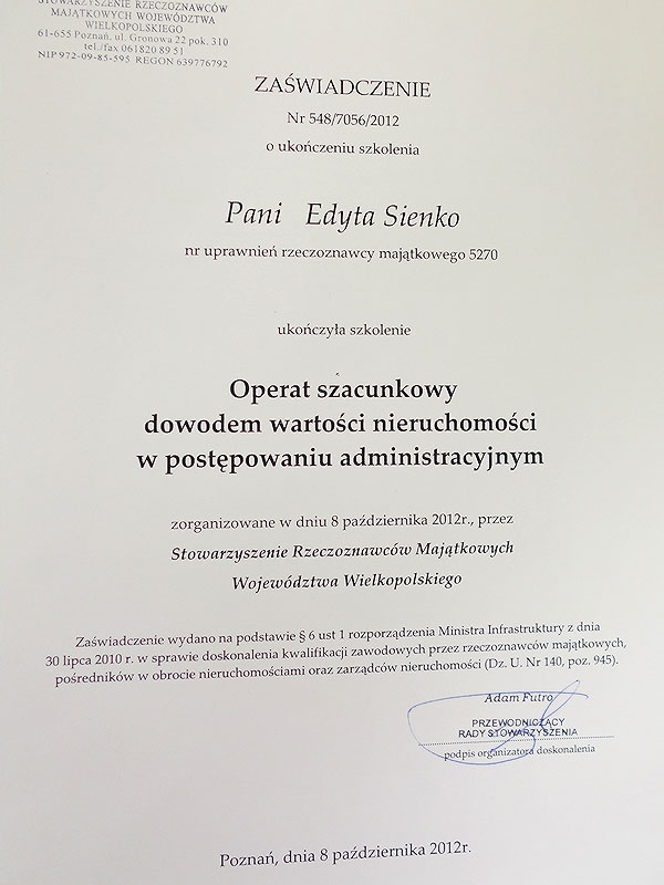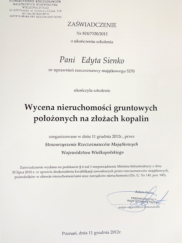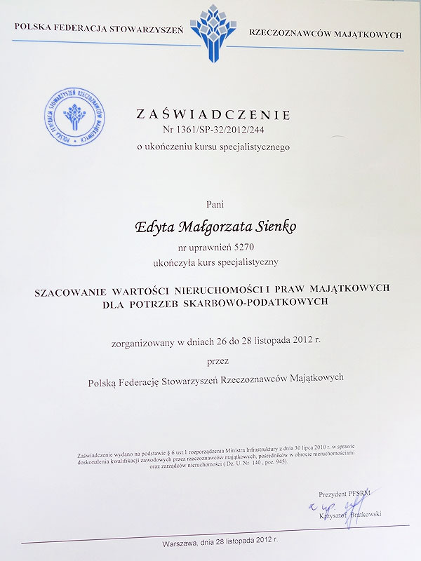 Uczestnik kursów specjalistycznych, warsztatów i seminariów organizowanych przez Polską Federację Rzeczoznawców Majątkowych z siedzibą w Warszawie.