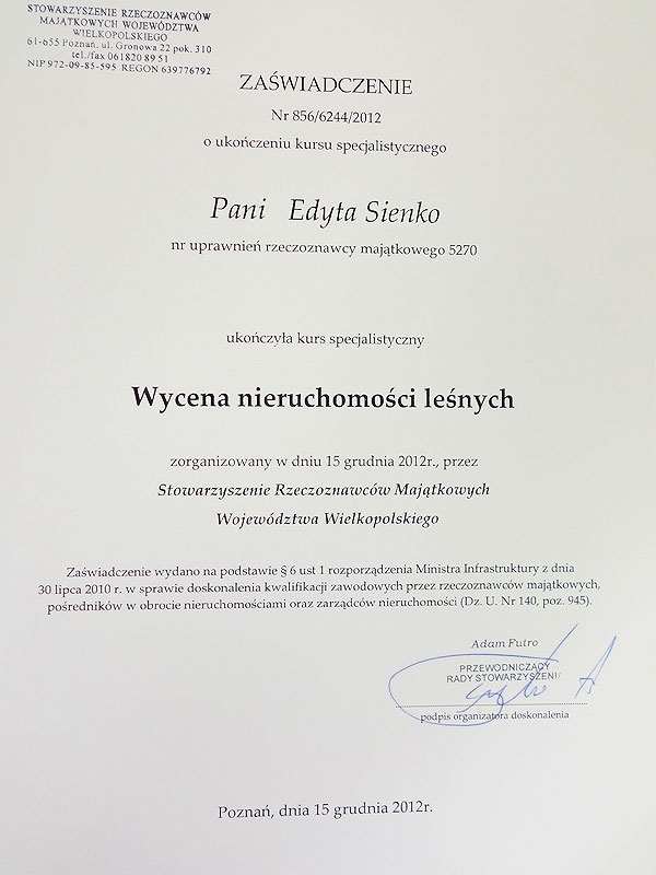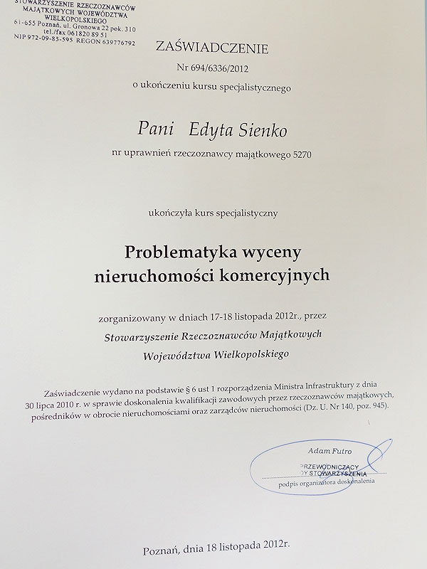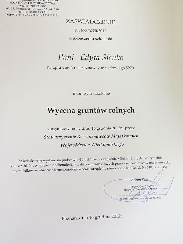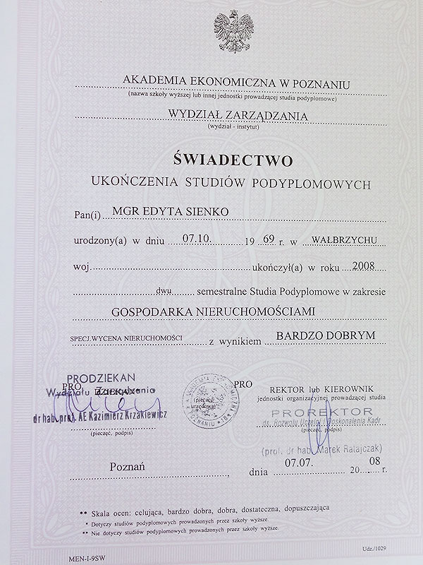 Absolwentka Akademii Ekonomicznej w Poznaniu. Ukończone Studium Podyplomowe w zakresie Gospodarka Nieruchomościami, specjalizacja : Wycena Nieruchomości na Wydziale Zarządzania Akademii Ekonomicznej w Poznaniu. Półtoraroczna praktyka zawodowa w Firmie z wieloletnim doświadczeniem na rynku nieruchomości „Talster’’ – Biuro Wycen i Obrotu Nieruchomościami pod kierunkiem Rzeczoznawcy Majątkowego Pana mgr inż. Stanisława Talarskiego, zakończona egzaminem państwowym przeprowadzonym przez Ministerstwo Infrastruktury.